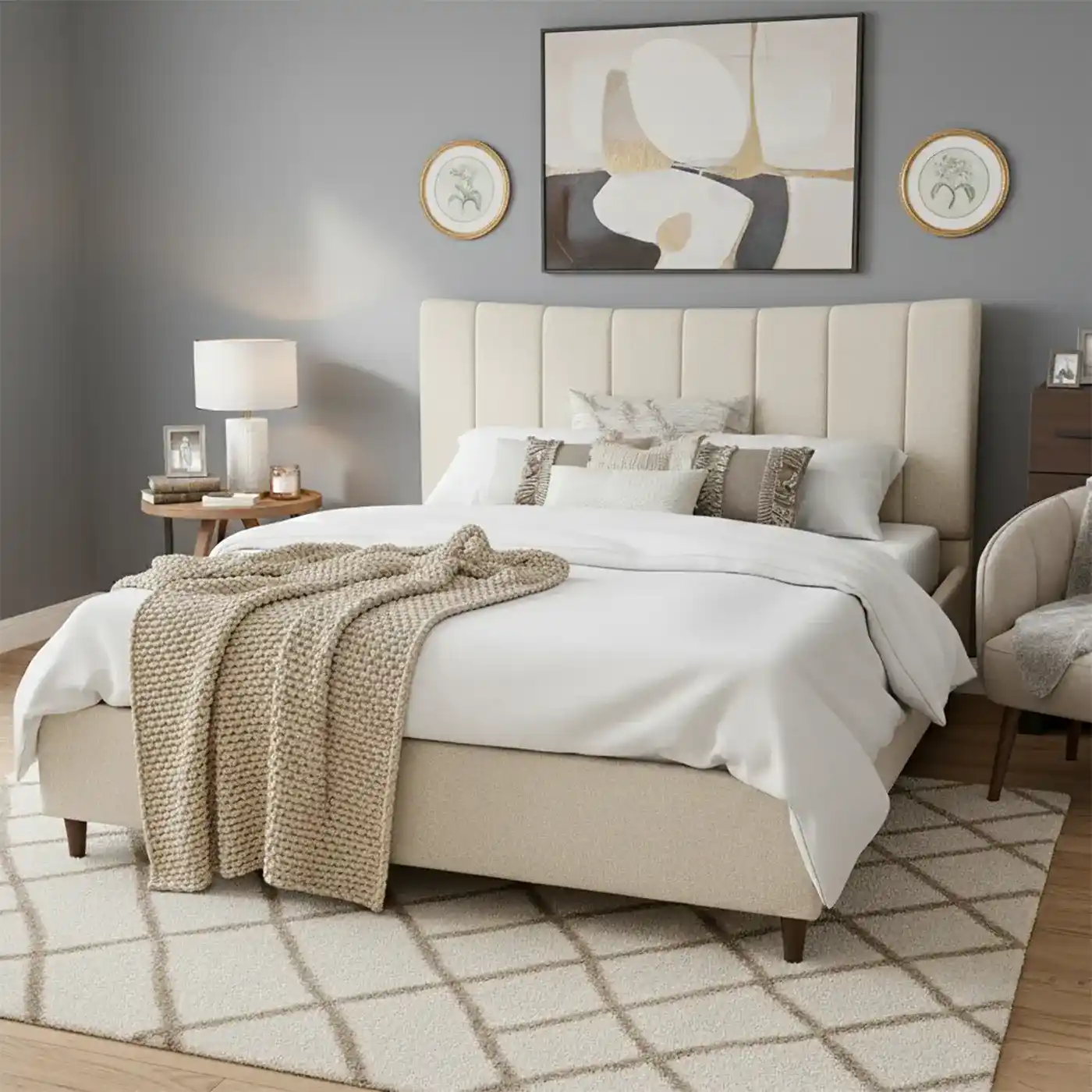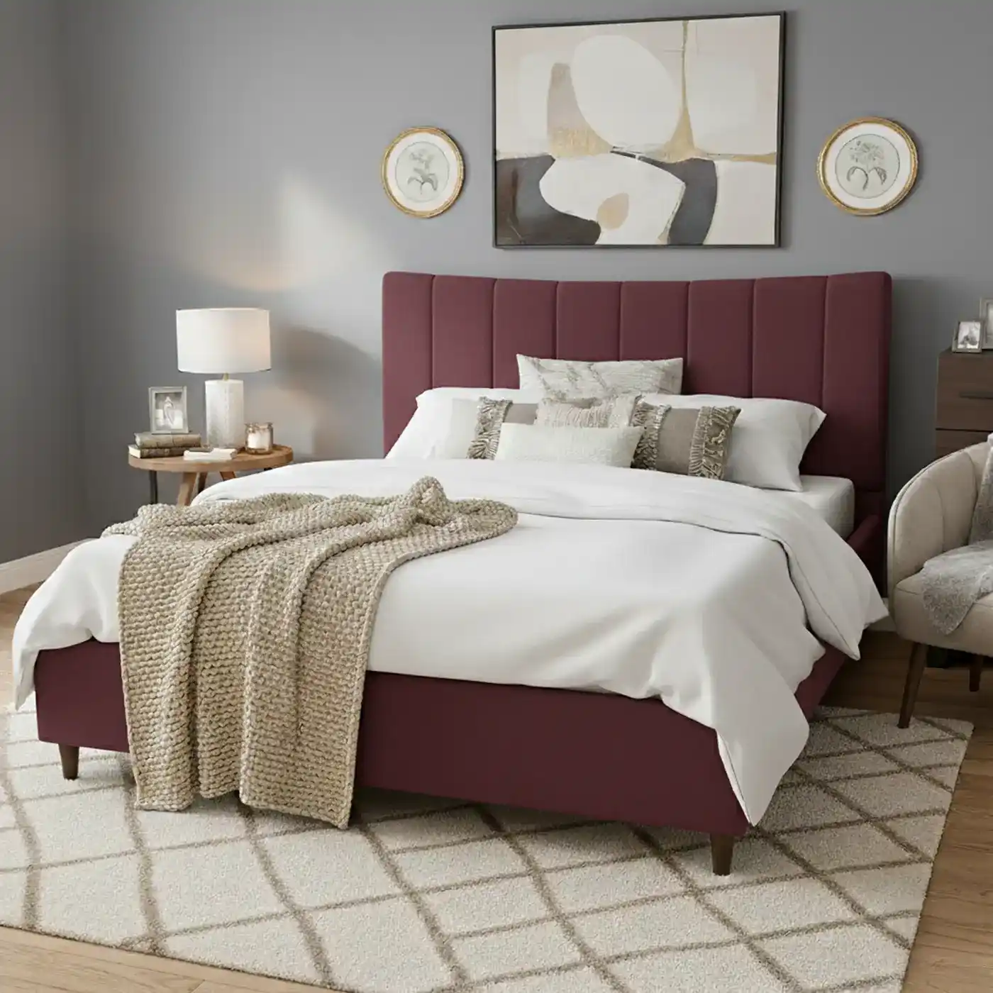 - Detailed linear stitching along headboard