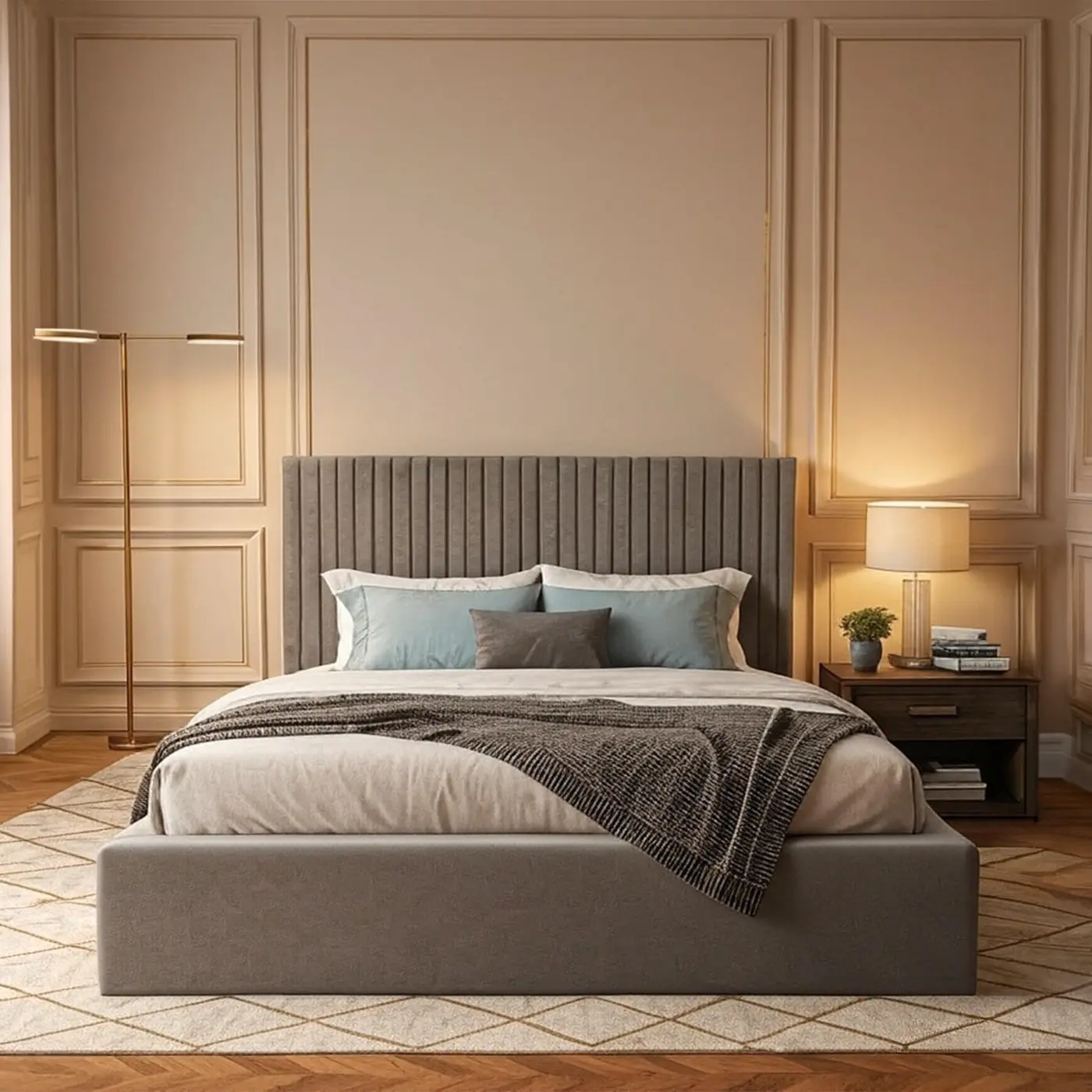 The Prisma Vertical Bed brings modern luxury to your bedroom with its elegant vertical-channel upholstered headboard and sleek low-profile platform design. Crafted with premium soft-touch fabric and a sturdy reinforced frame, it delivers both style and long-lasting comfort. Perfect for contemporary homes and luxury interiors.