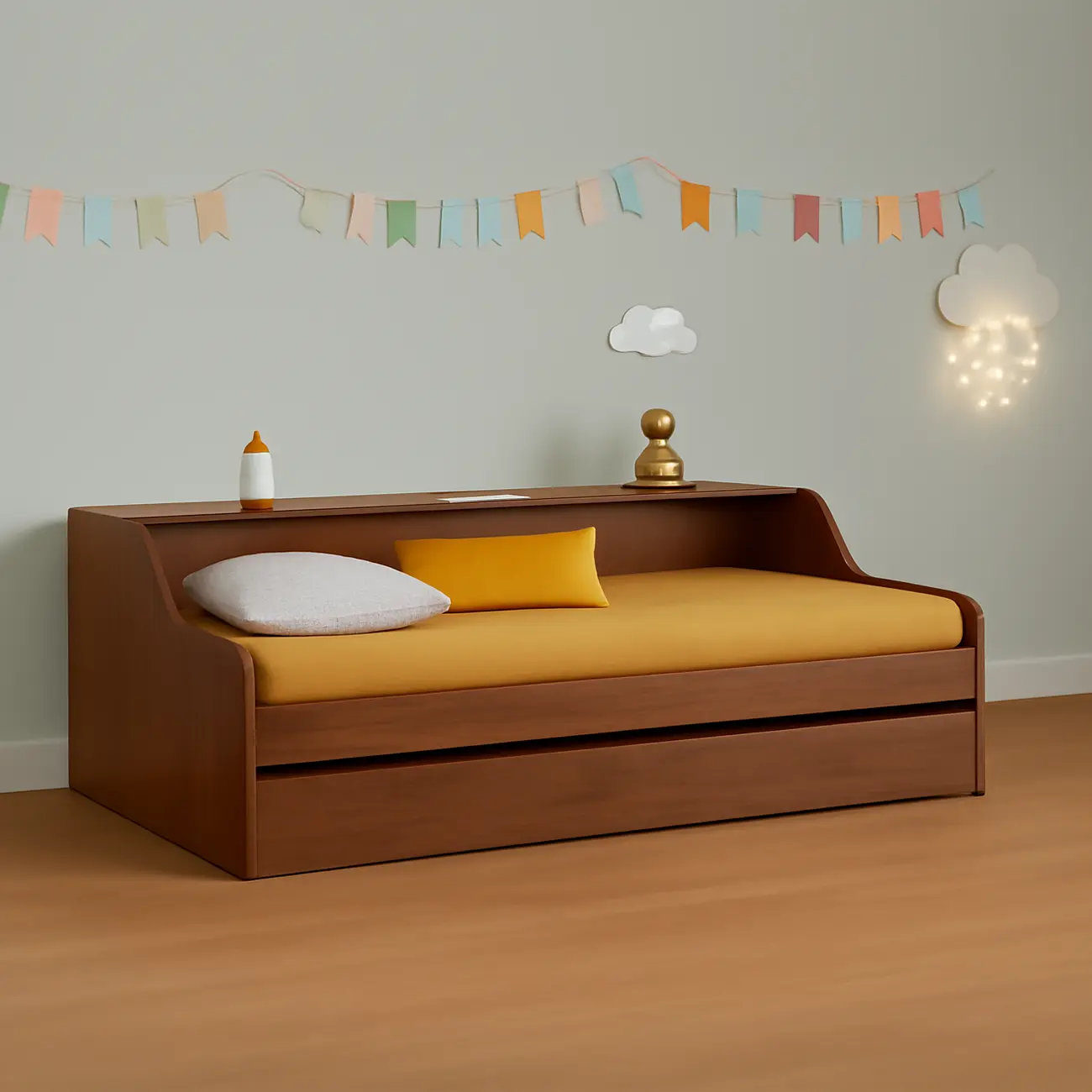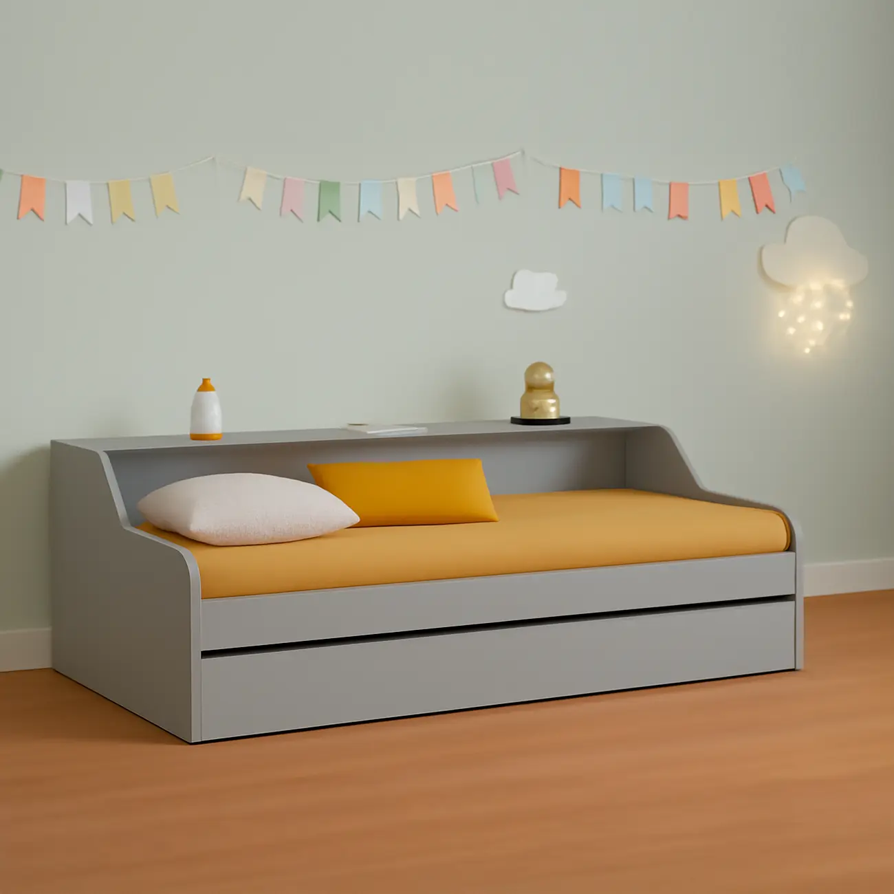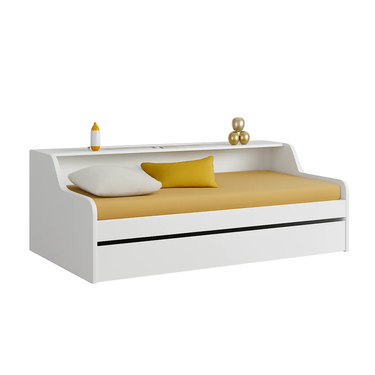 Elevate your bedroom with our versatile trundle bed, measuring 205cm in length, 110cm in width, and 80cm in height. Designed for both comfort and convenience, it features a sleek and modern aesthetic that complements any decor. The main bed offers a cozy spot for rest, while the pull-out trundle bed provides additional sleeping space for guests or sleepovers. Crafted with sturdy materials and a focus on practicality, this bed combines style with functionality, making it a perfect choice for maximizing space in smaller rooms.