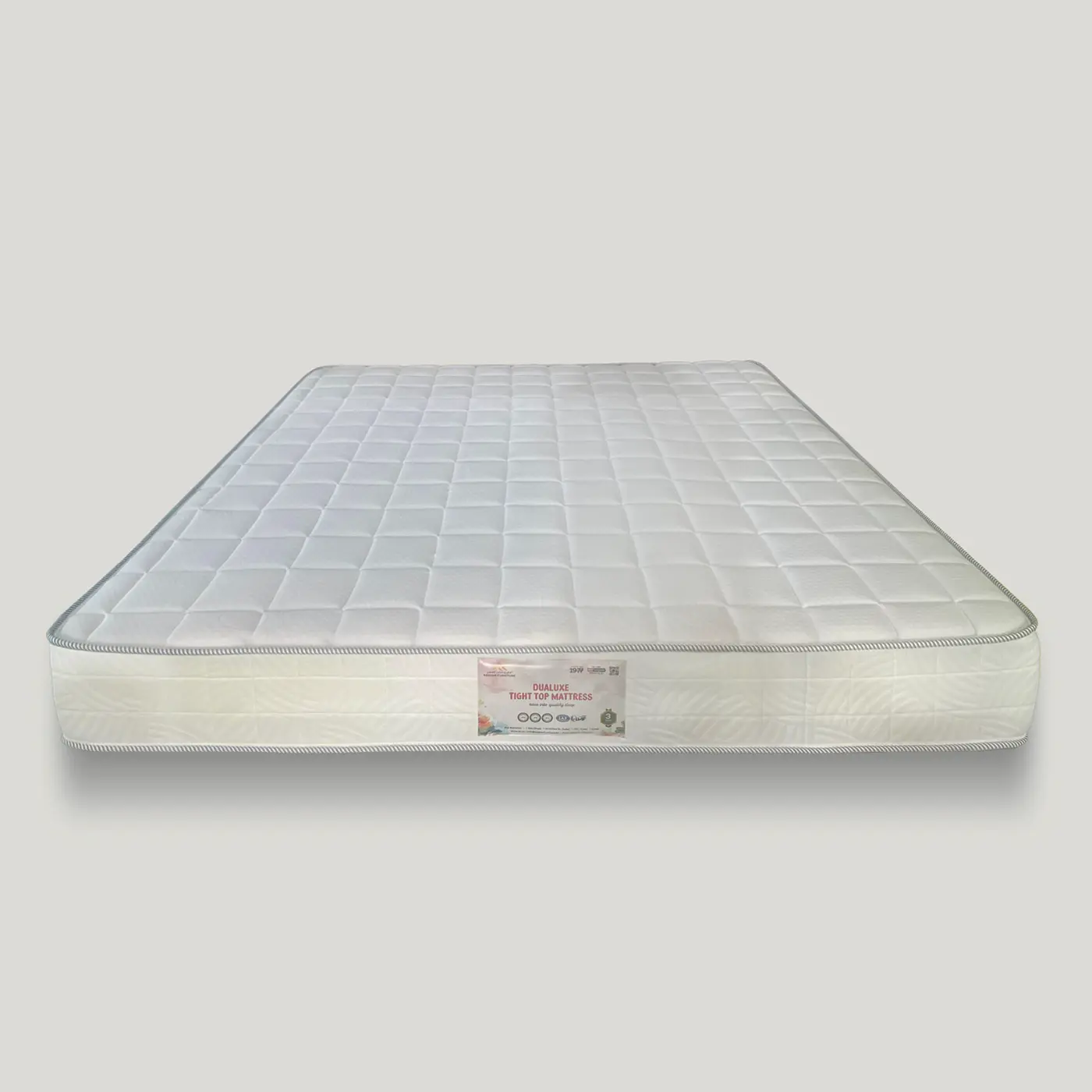 Dualuxe Tight Top Mattress delivers firm, reliable support with a durable Bonnell spring system, hard foam, and soft comfort layers. The knitted fabric top adds a smooth, breathable surface, while reinforced edges and quilted borders enhance durability and style. Ideal for back and stomach sleepers seeking lasting comfort at great value. Backed by a 3-year warranty for peace of mind.
