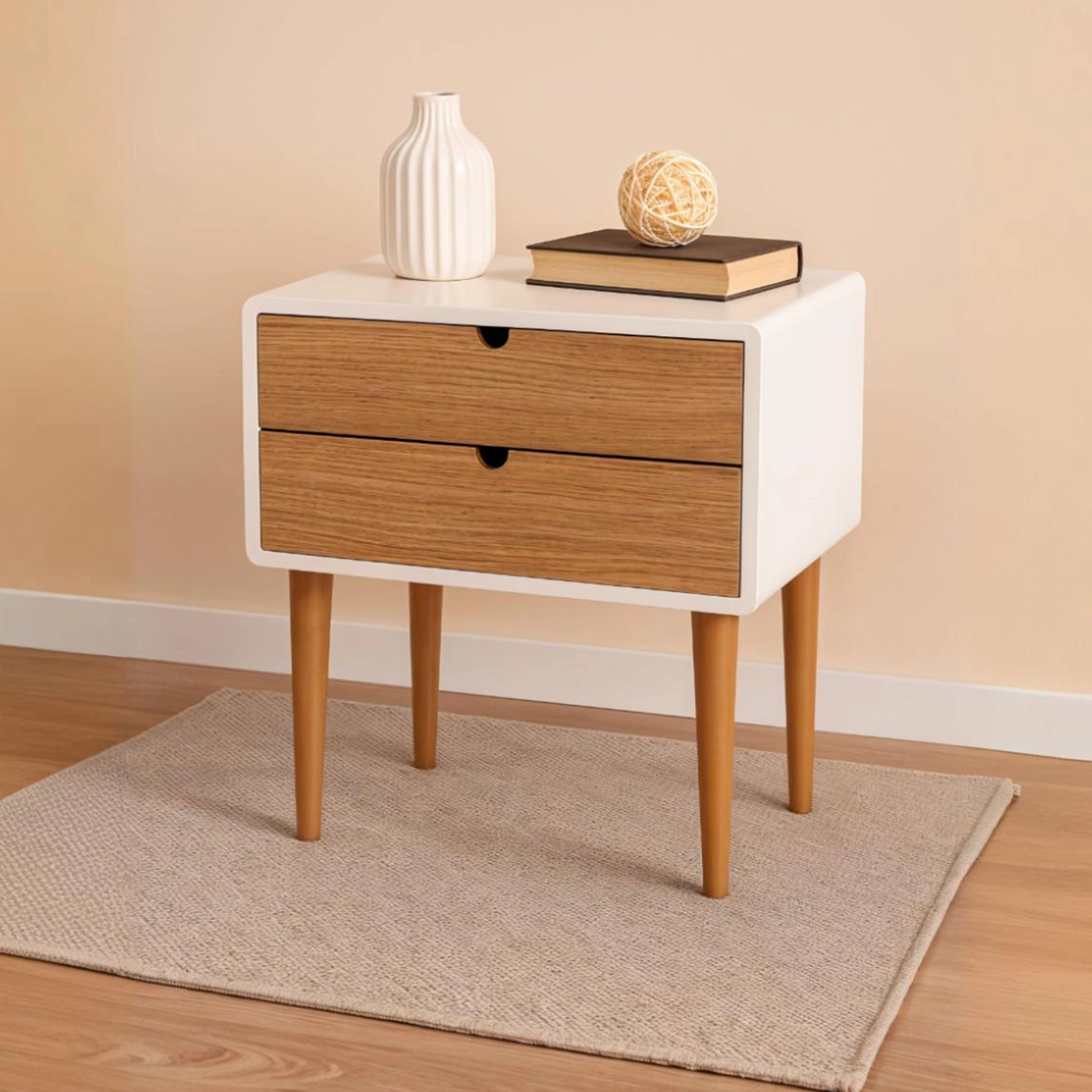 Simple, sleek, and effortlessly stylish, the Lino Side Table brings calm functionality to your space. Featuring two spacious drawers with natural wood fronts and smooth cut-out handles, it’s perfect for storing bedside essentials or living room clutter. Supported by gently tapered legs, this compact table adds a warm, minimal touch to any interior.