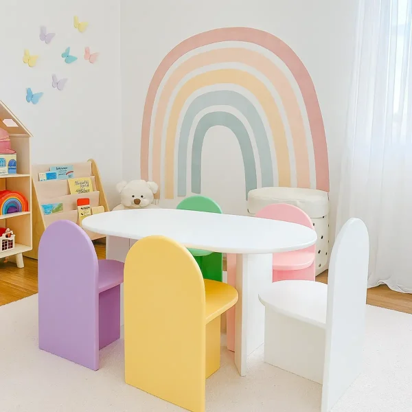 The TinyArc Kids Table Set pairs a smooth oval table with colourful arch-back chairs, creating a safe, child-friendly space for learning, crafts, and play. Its rounded edges, sturdy construction, and pastel design make it an ideal activity set for modern playrooms, nurseries, and preschool environments.