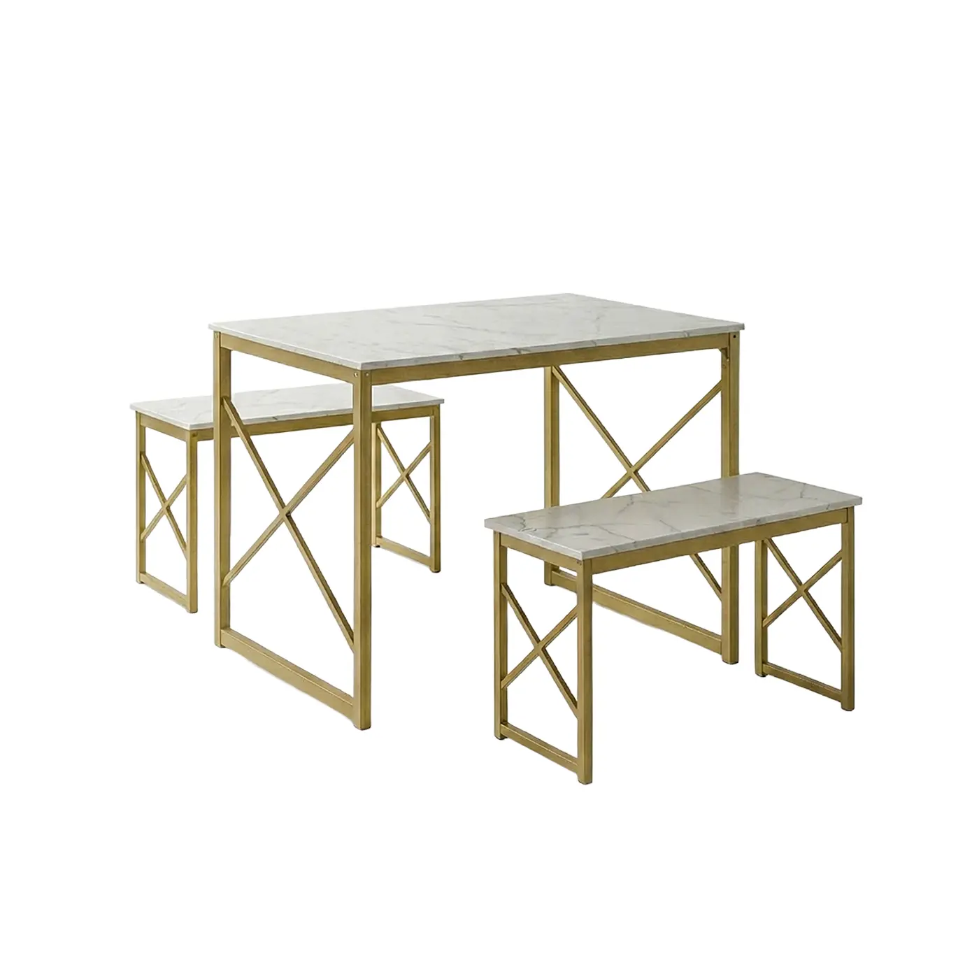 The Stellaro Dining Set elevates any dining space with its luxurious faux-marble tabletop and sleek gold metal frame. Designed for modern homes, this space-efficient table with matching benches offers durability, easy maintenance, and stylish comfort. Perfect for kitchens, apartments, or open dining areas.